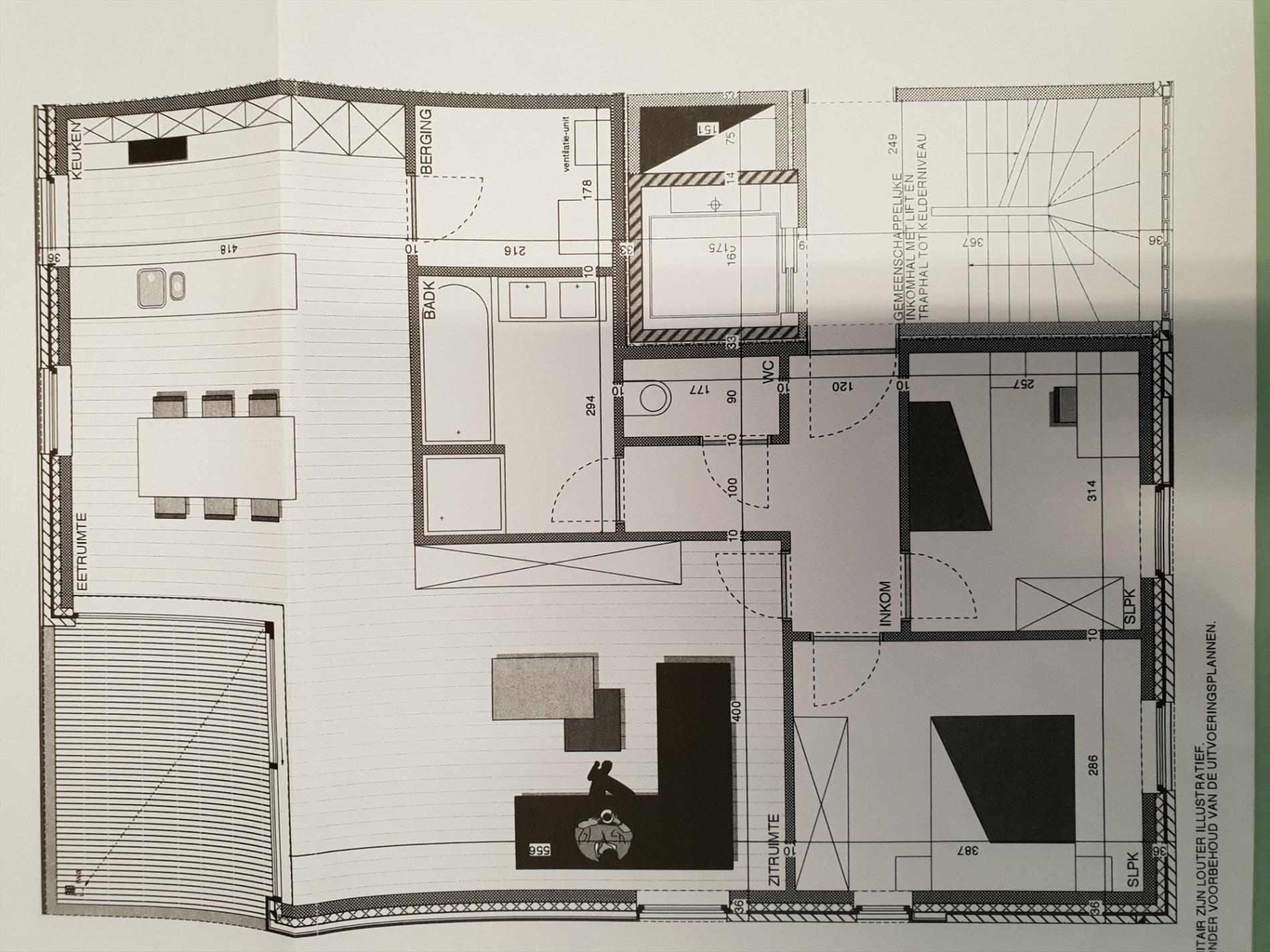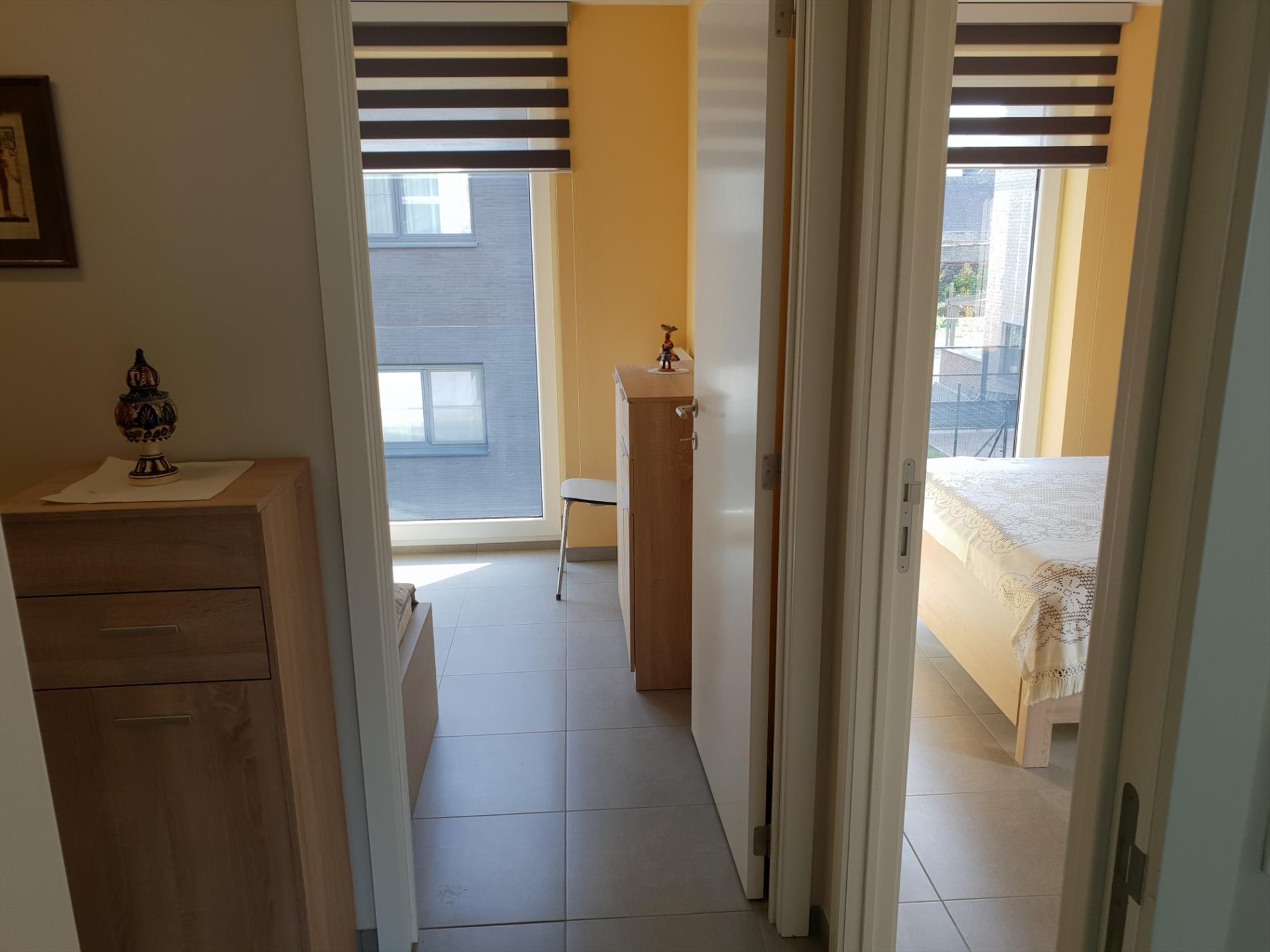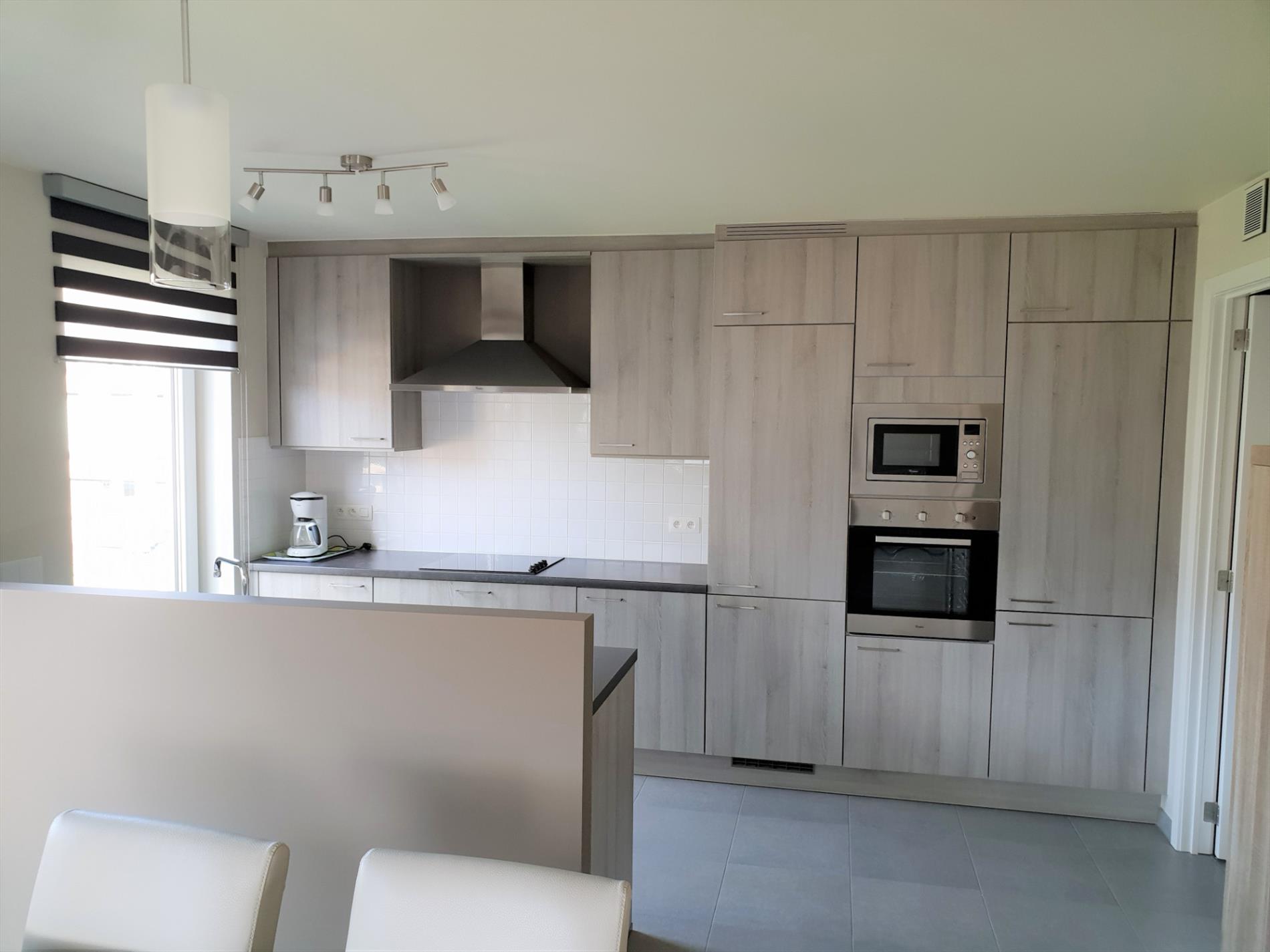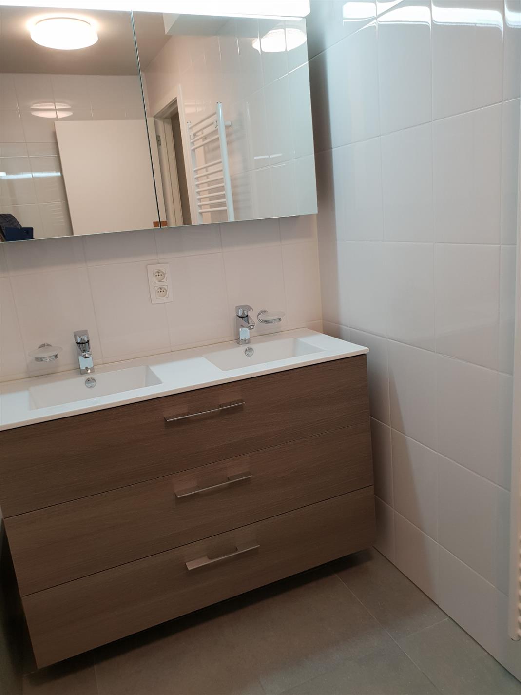 Indeling : inkomhall/nachthall met toegang naar de badkamer 6m² met bad+douche+lavabomeubel - 2 slaapkamers (12-9m²) - apart toilet met lavabo - woonkamer in L-vorm 32m² - open keuken van 10m² (vaatwas/elektrisch fornuis-oven-microgolf-dampkap - ingebouwde koelkast en diepvriezer) - berging met aansluiting voor wasmachine.
