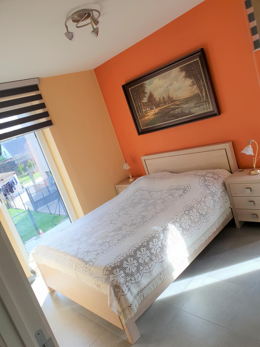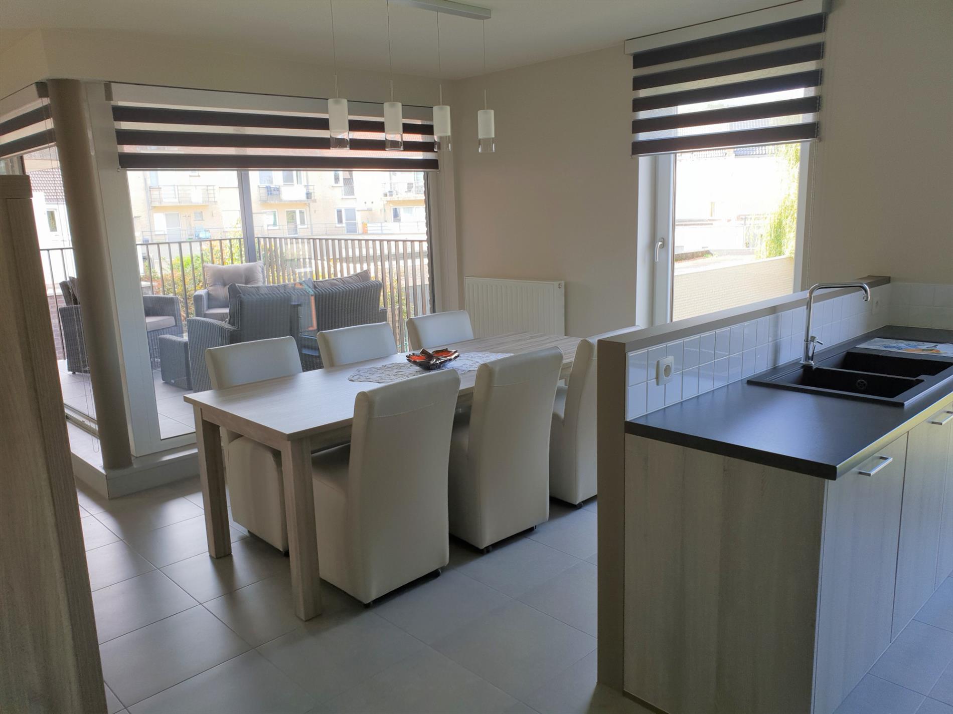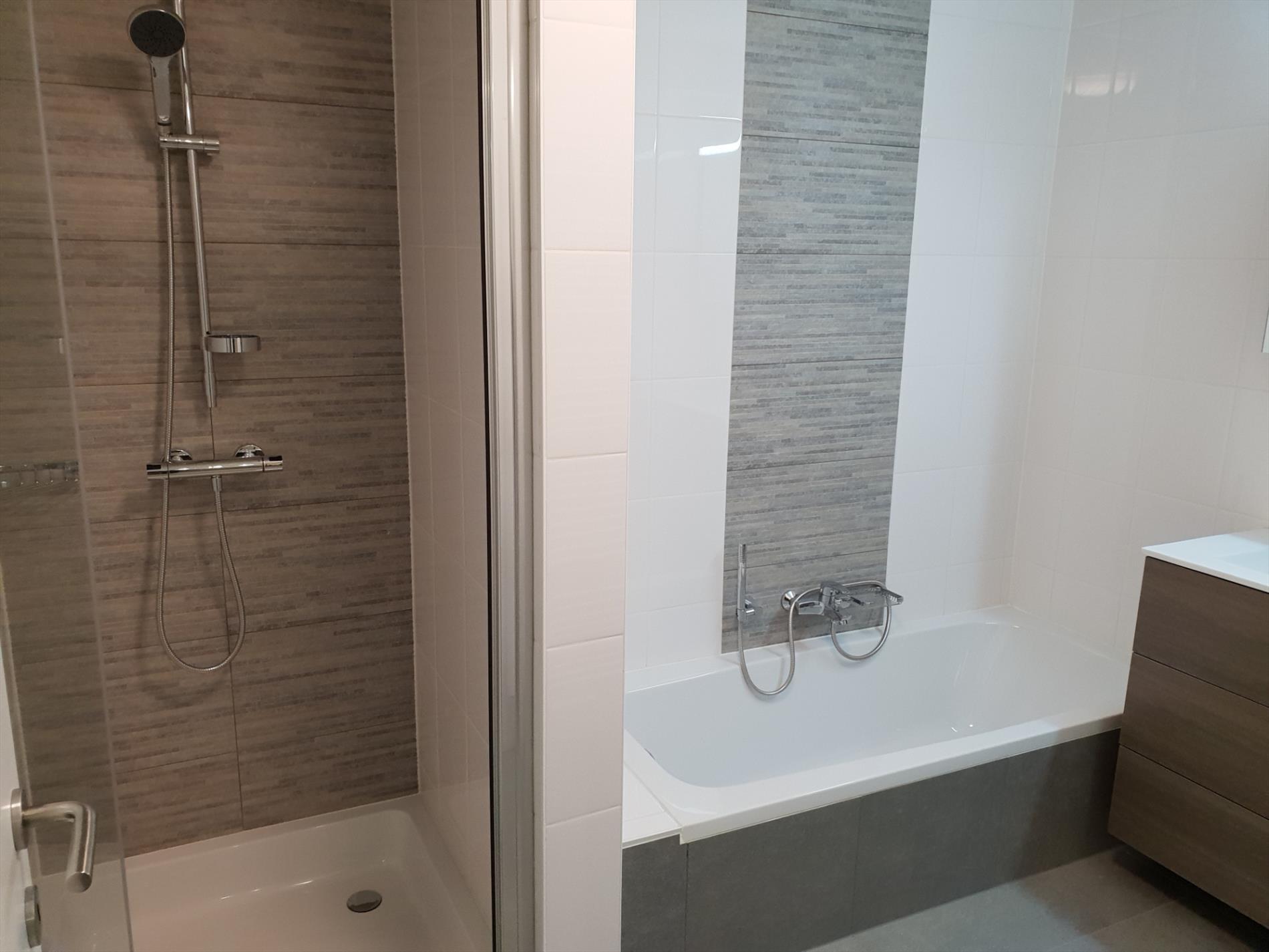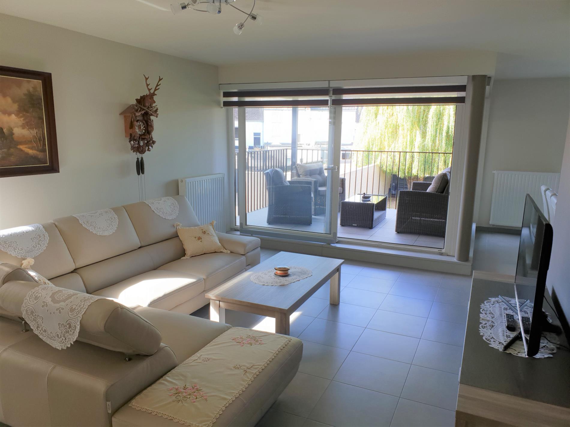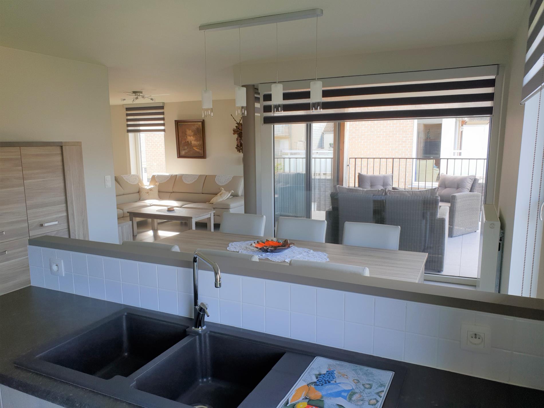Indeling : inkomhall/nachthall met toegang naar de badkamer 6m² met bad+douche+lavabomeubel - 2 slaapkamers (12-9m²) - apart toilet met lavabo - woonkamer in L-vorm 32m² - open keuken van 10m² (vaatwas/elektrisch fornuis-oven-microgolf-dampkap - ingebouwde koelkast en diepvriezer) - berging met aansluiting voor wasmachine.