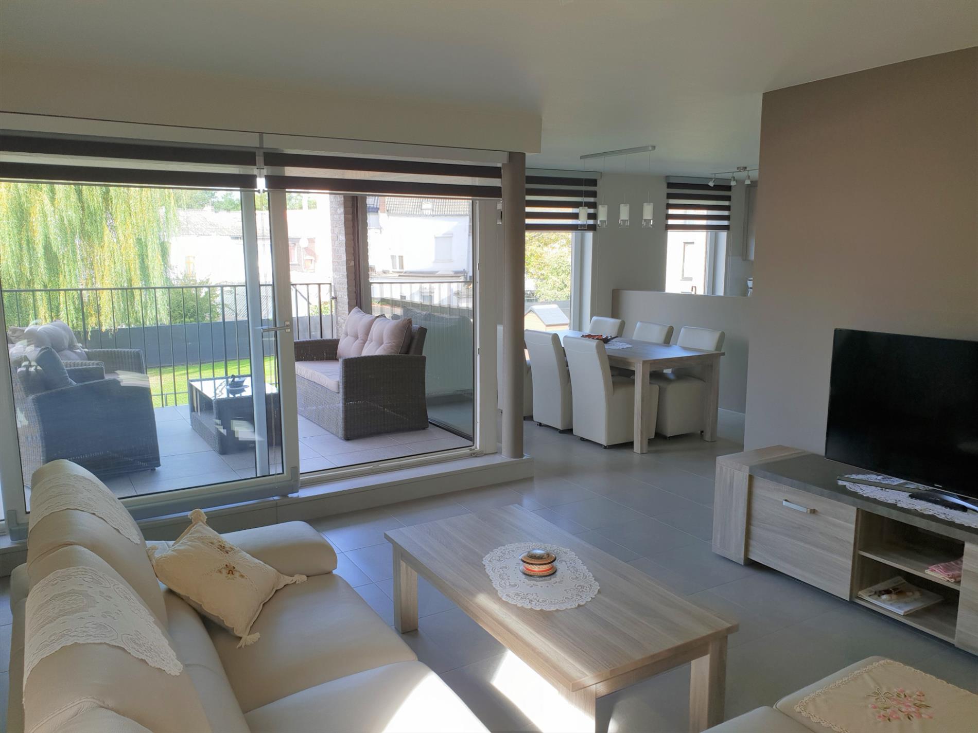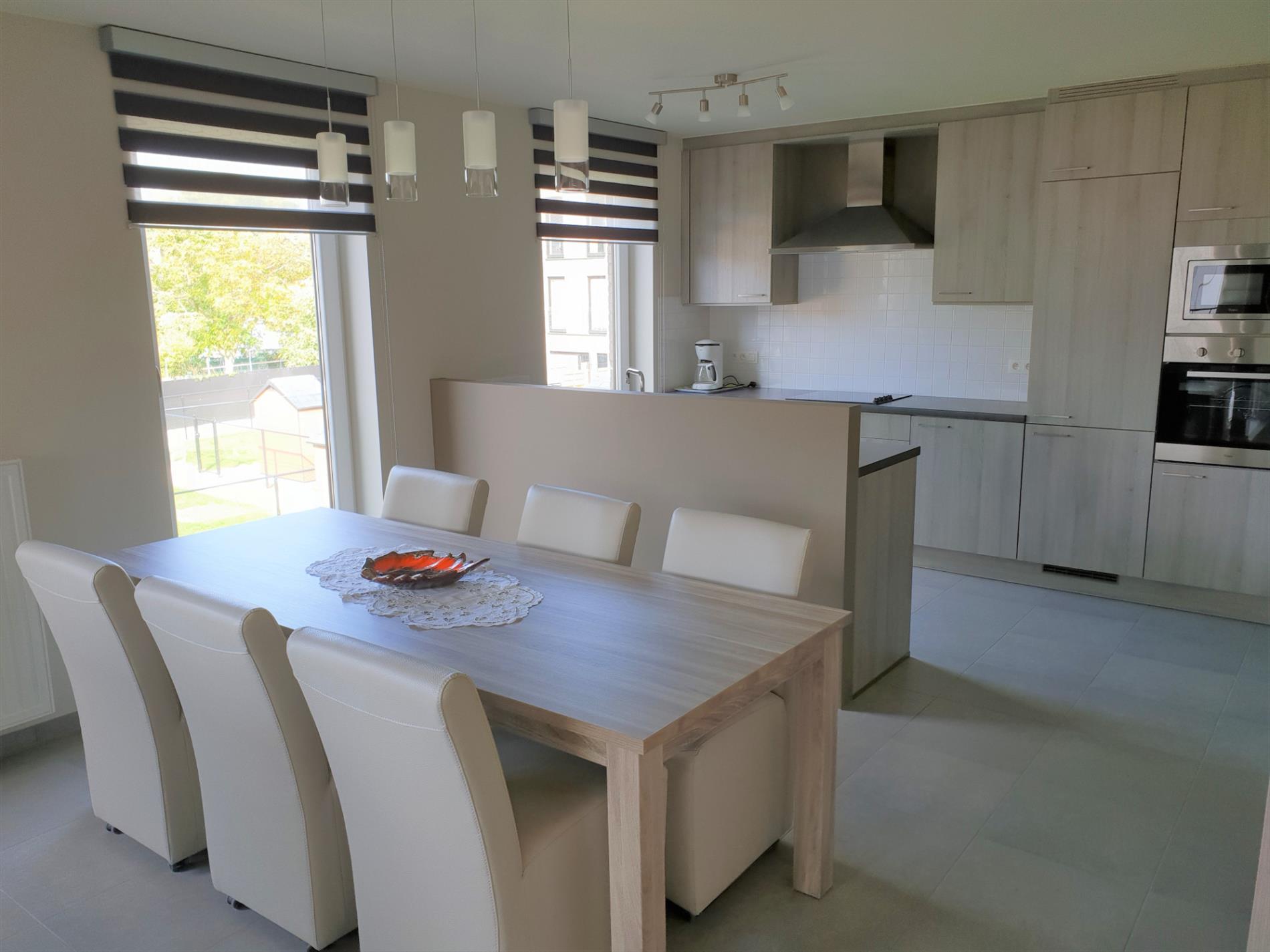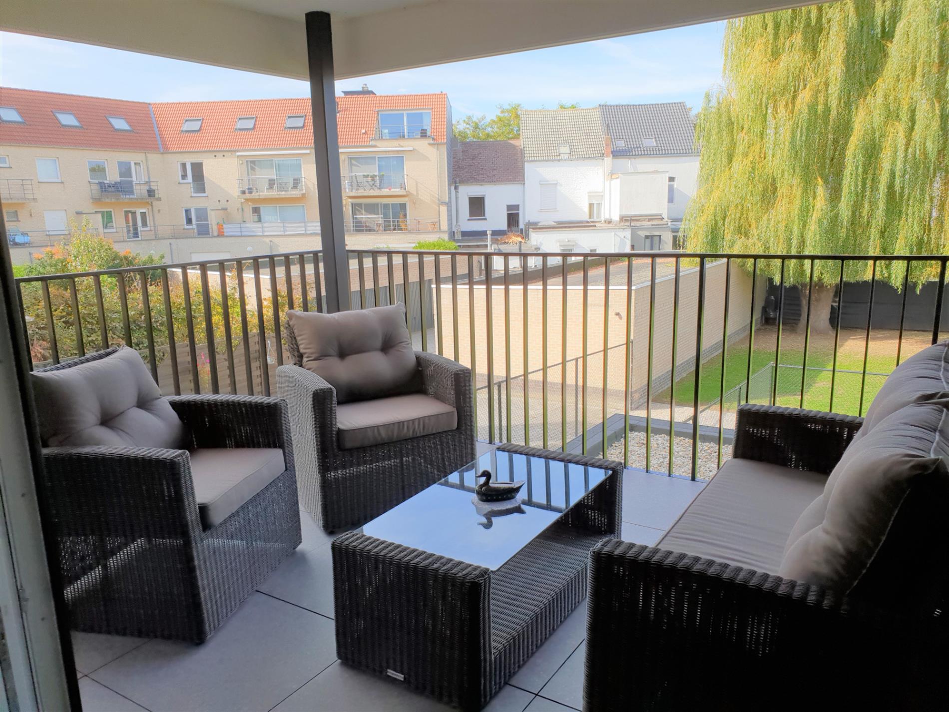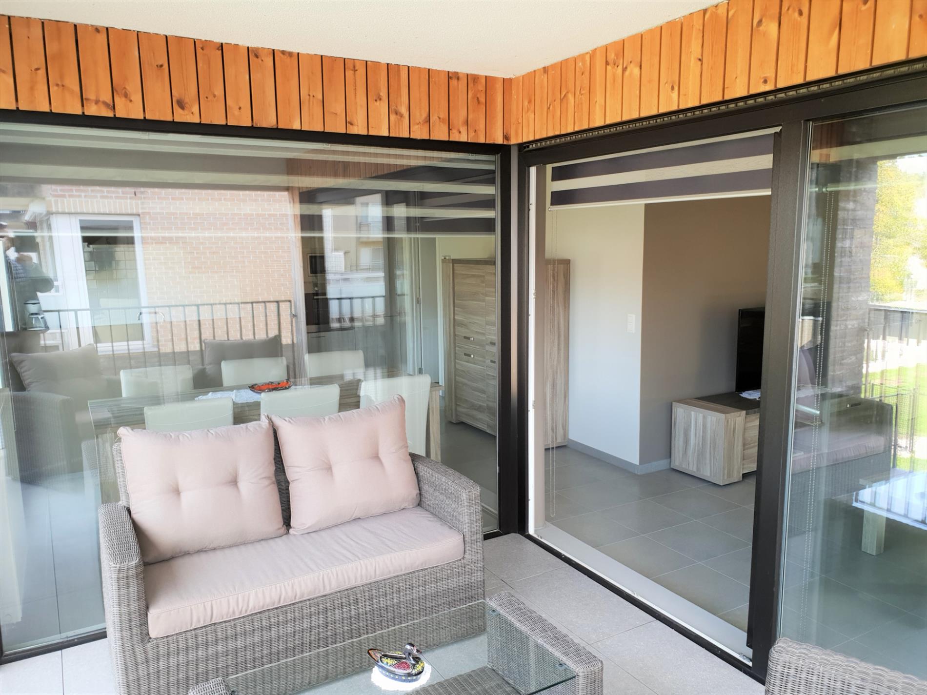 Indeling : inkomhall/nachthall met toegang naar de badkamer 6m² met bad+douche+lavabomeubel - 2 slaapkamers (12-9m²) - apart toilet met lavabo - woonkamer in L-vorm 32m² - open keuken van 10m² (vaatwas/elektrisch fornuis-oven-microgolf-dampkap - ingebouwde koelkast en diepvriezer) - berging met aansluiting voor wasmachine.