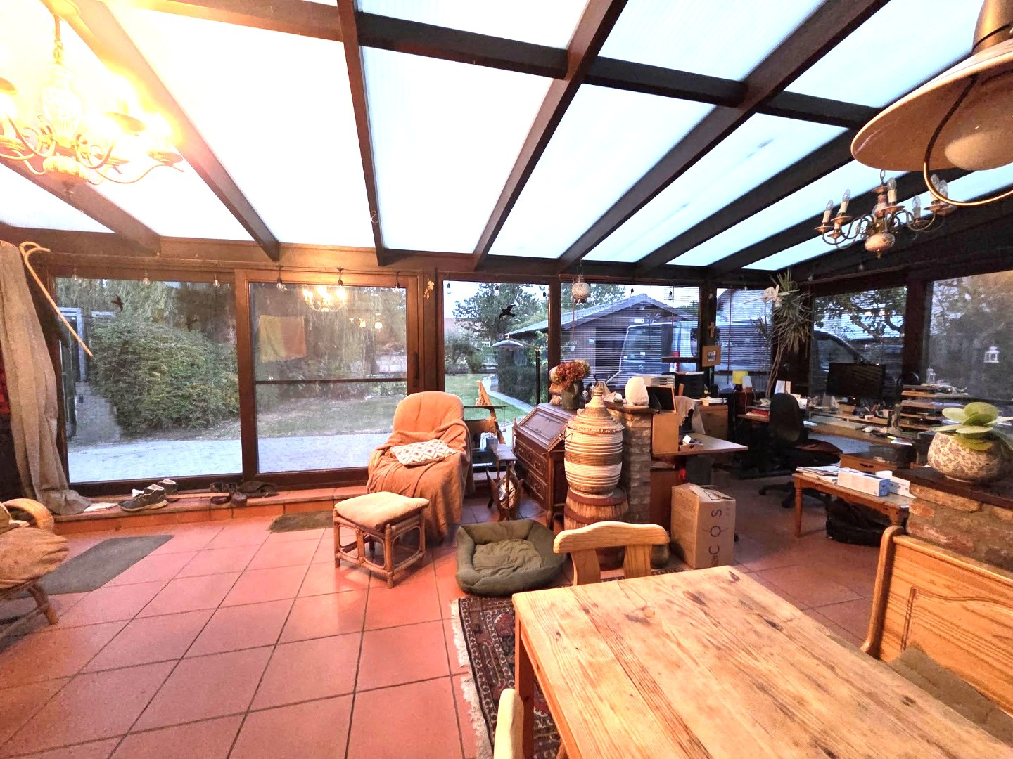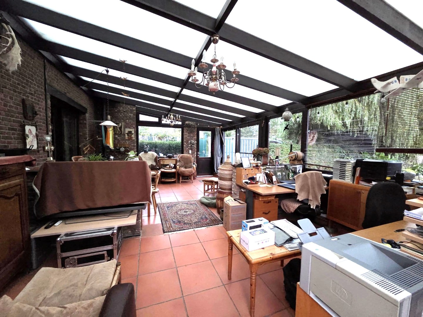 Gelijkvloers : inkomhall - woonkamer 30m² - keuken 11m² - bureau 12m² - slaapkamer 9m² - badkamer (douche + lavabomeubel) 6m² - woonveranda 38m².