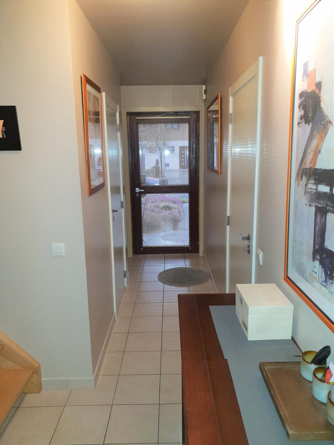 De inkomhall geeft toegang tot de garage, toilet, berging (wasmachine en droogkast) , en de woonkamer in L-vorm (32m²).