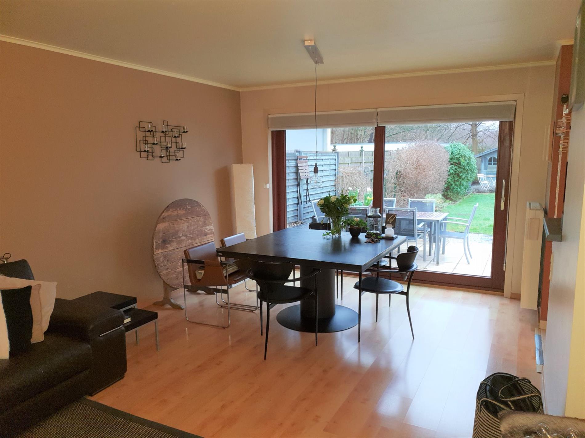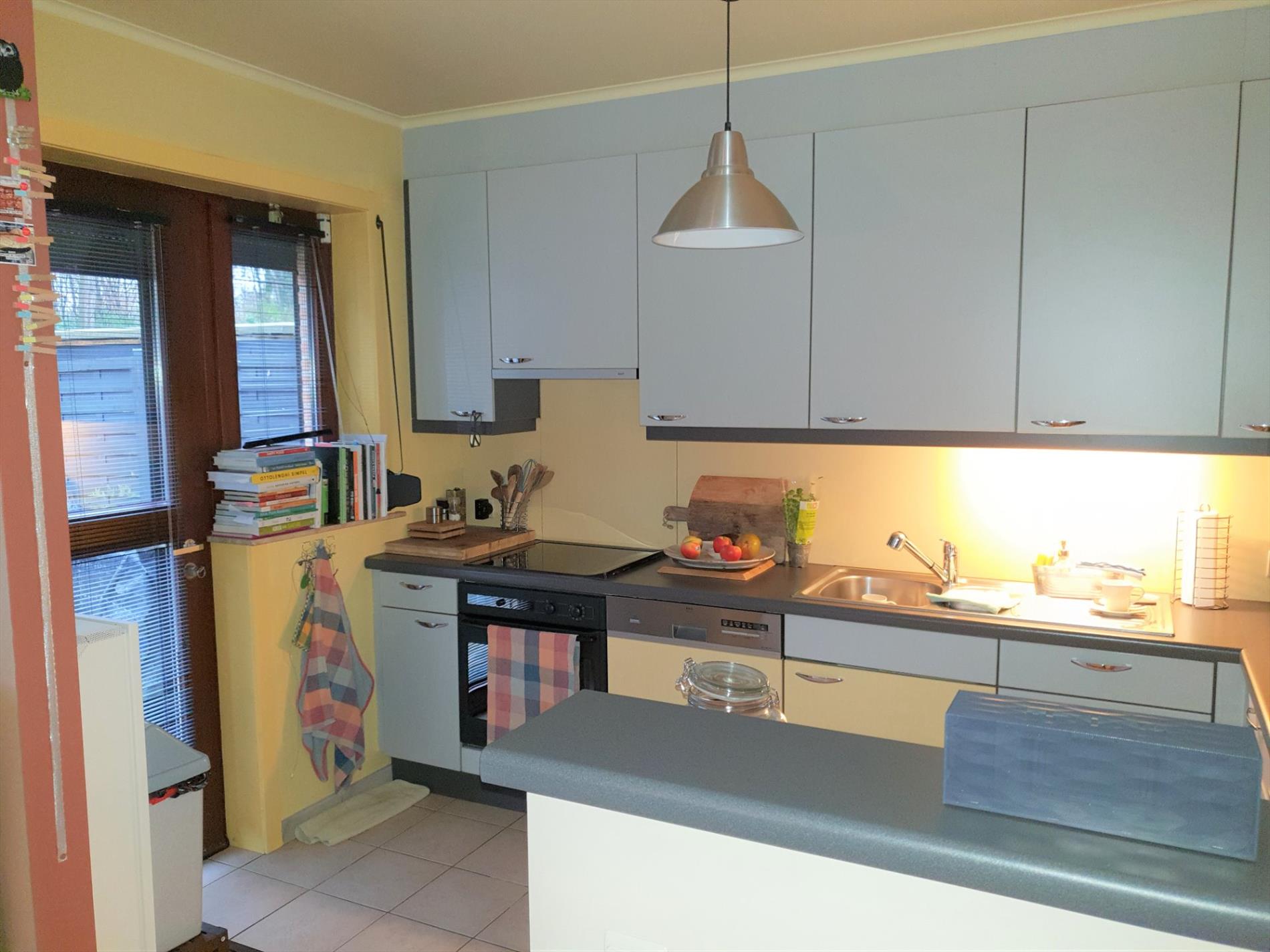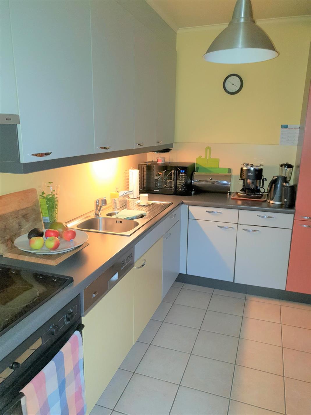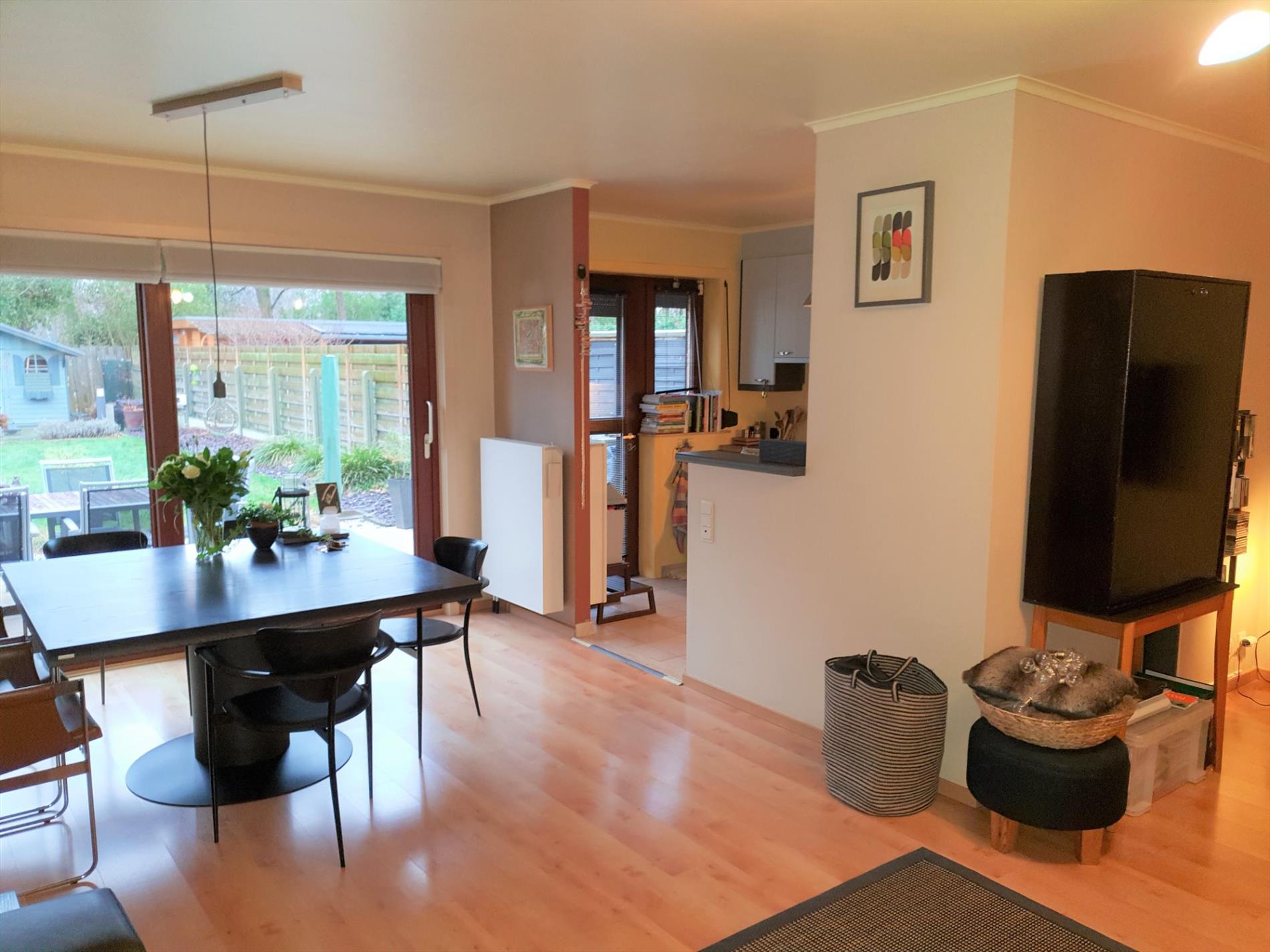 De halfopen keuken is netjes ingericht en biedt zich op de aangename tuin (groene zone achteraan).