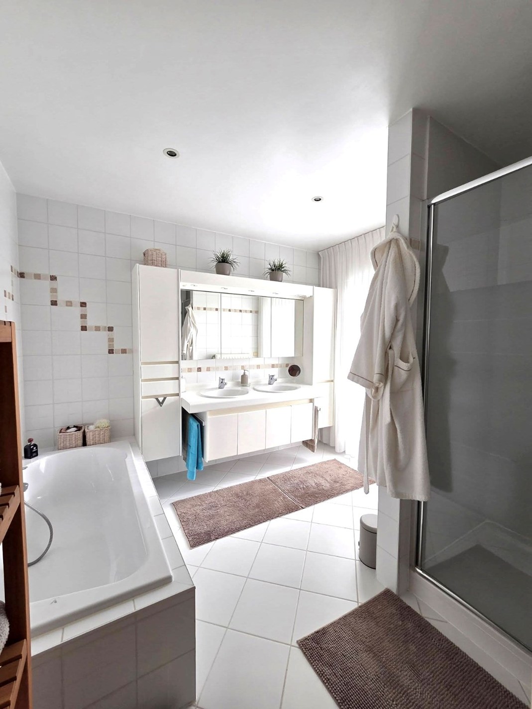 Op de eerste verdieping bevinden zich drie volwaardige slaapkamers van respectievelijk 12 m², 15 m² en 16 m², evenals een ruime badkamer (11 m²) uitgerust met dubbele lavabo, bad, douche en toilet.